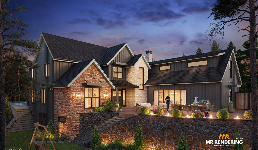 Rustic Modern Home with Stone and Dark Siding at Dusk in Australia – Enjoy more 3D rendering service in Australia now!