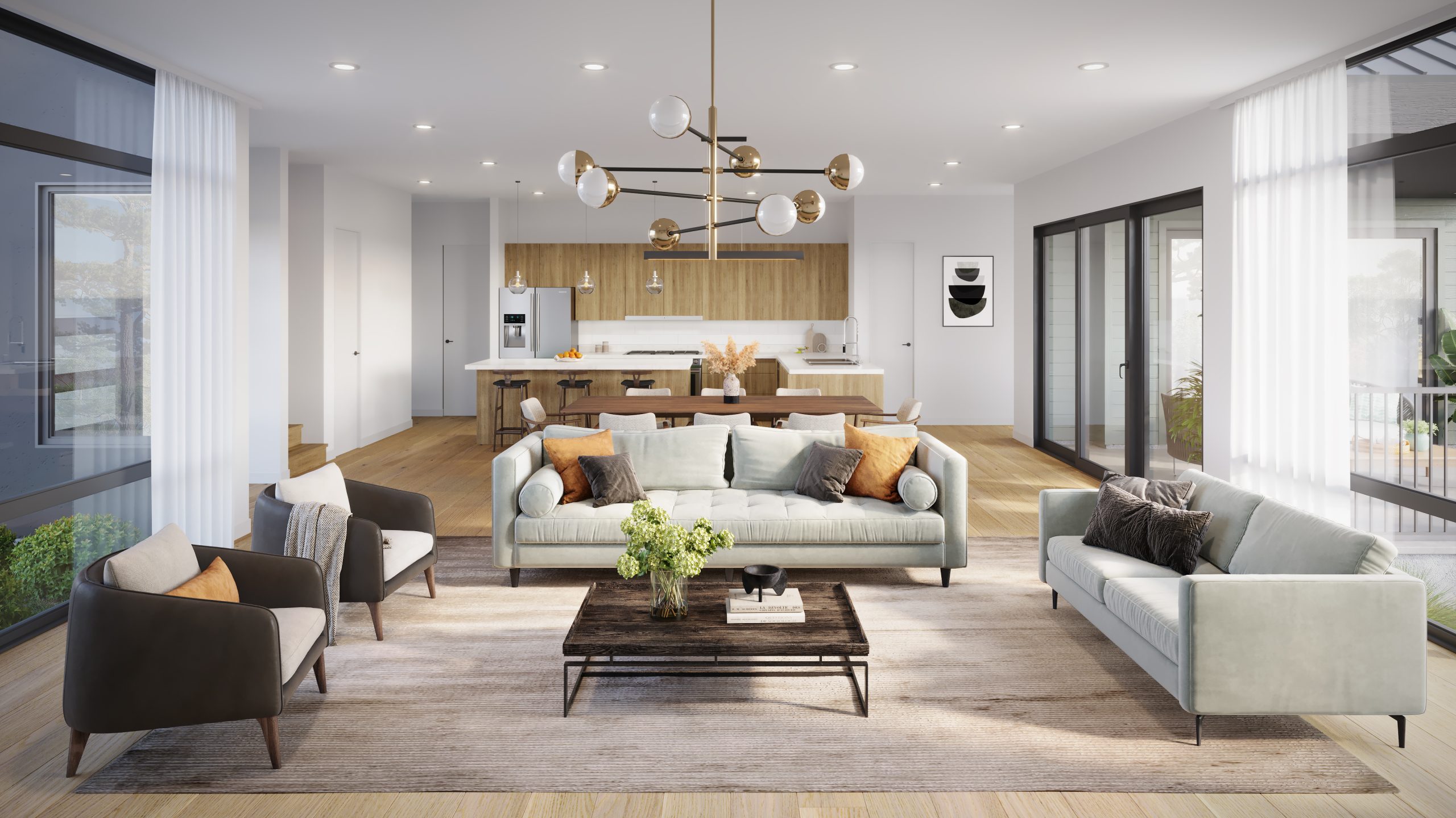 3D Interior Rendering – Contemporary Open Living Room & Kitchen Design / Irvine, California, USA