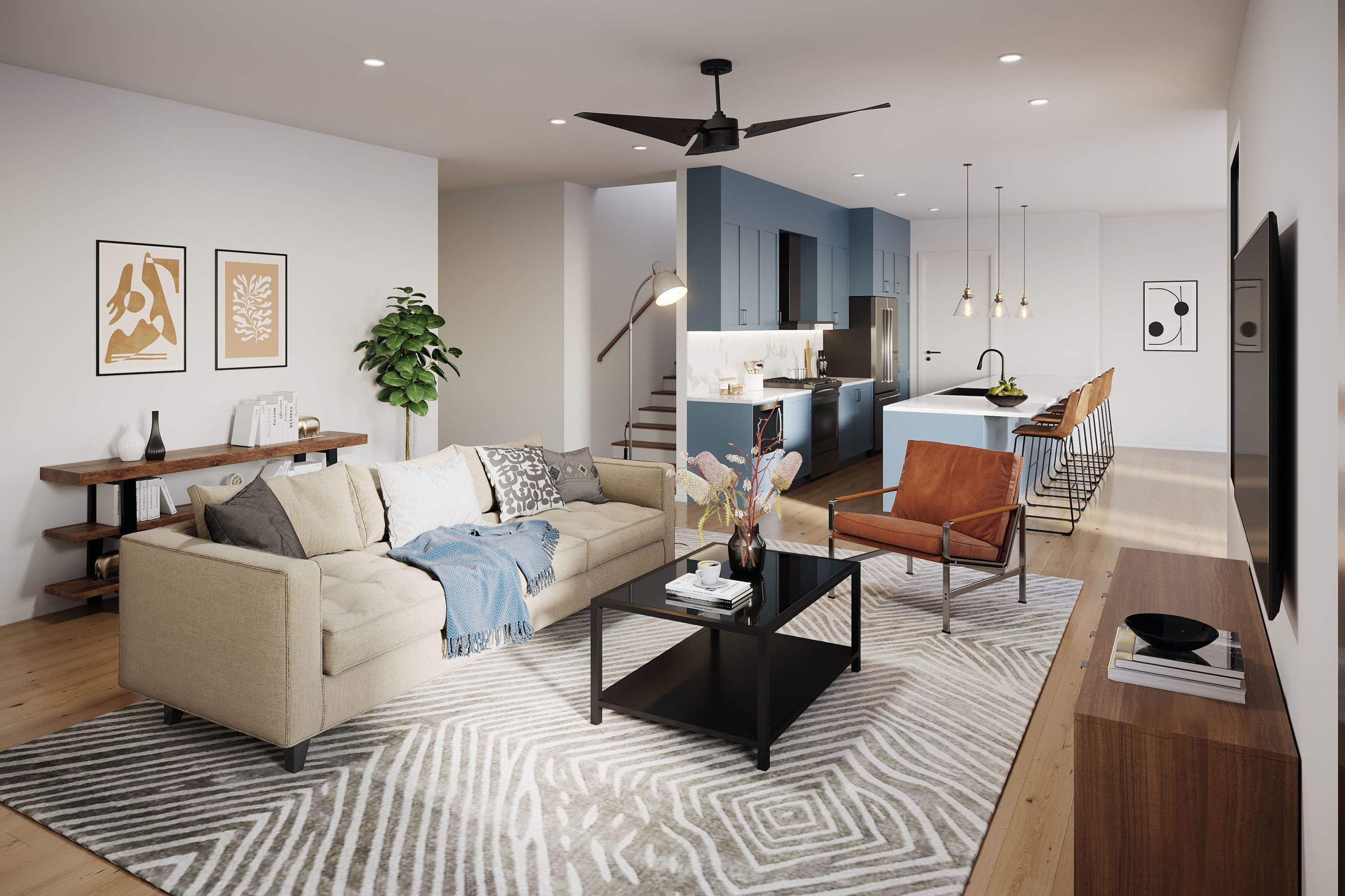 3D Interior Rendering – Contemporary Open-Concept Living Room & Kitchen / San Diego, California, USA