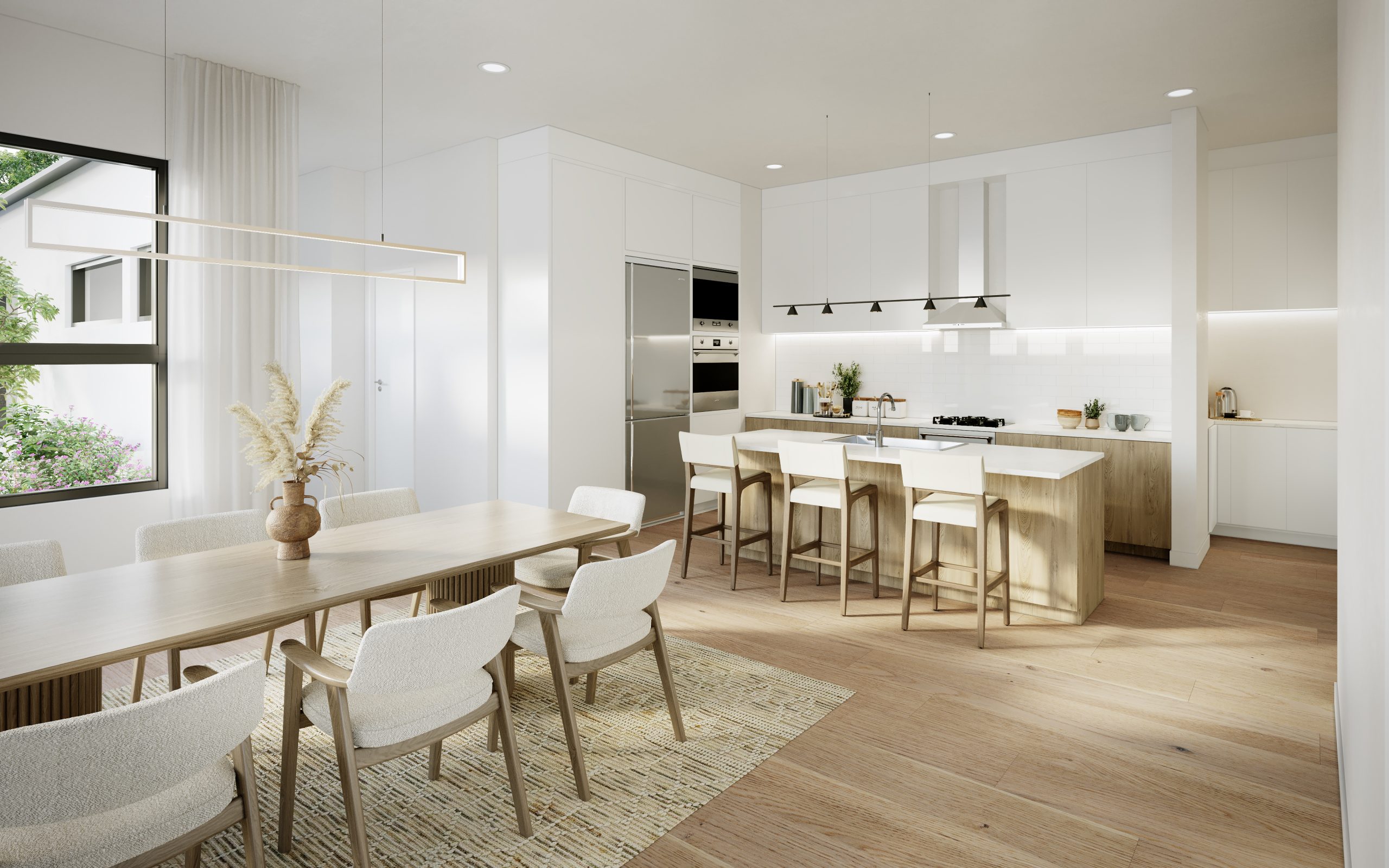 3D Interior Rendering – Modern Minimalist Kitchen & Dining Space / Austin, Texas, USA