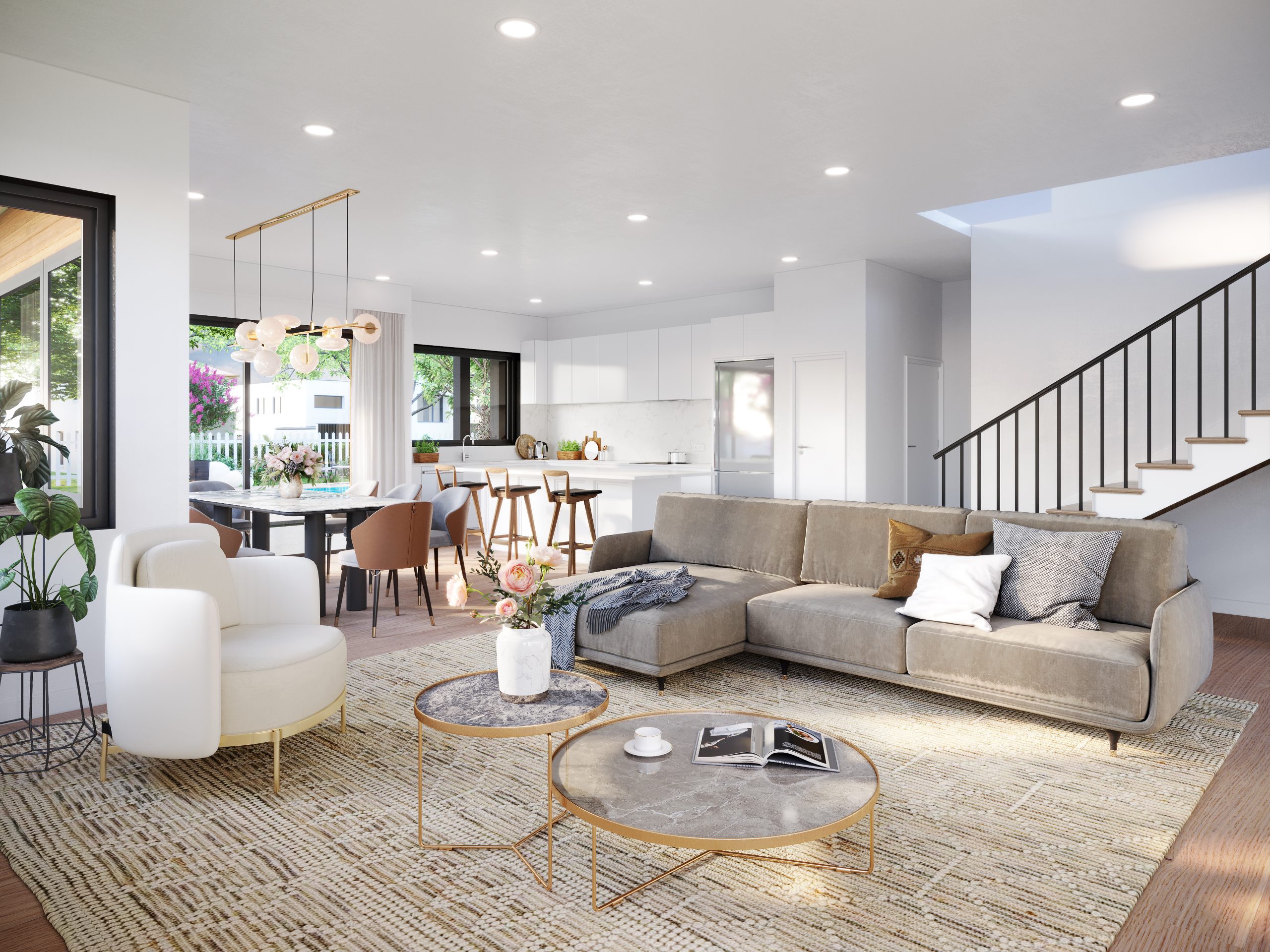 3D Interior Rendering – Modern Open-Concept Living & Kitchen Area / Sacramento, California, USA