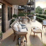 3D real estate floor plan drawings for a modern, multi-level apartment, detailing the large outdoor terrace, living area, and bedrooms.