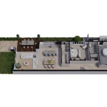 3D real estate floor plan drawings of a long, modern villa showcasing a pool, outdoor kitchen, and attached garage.